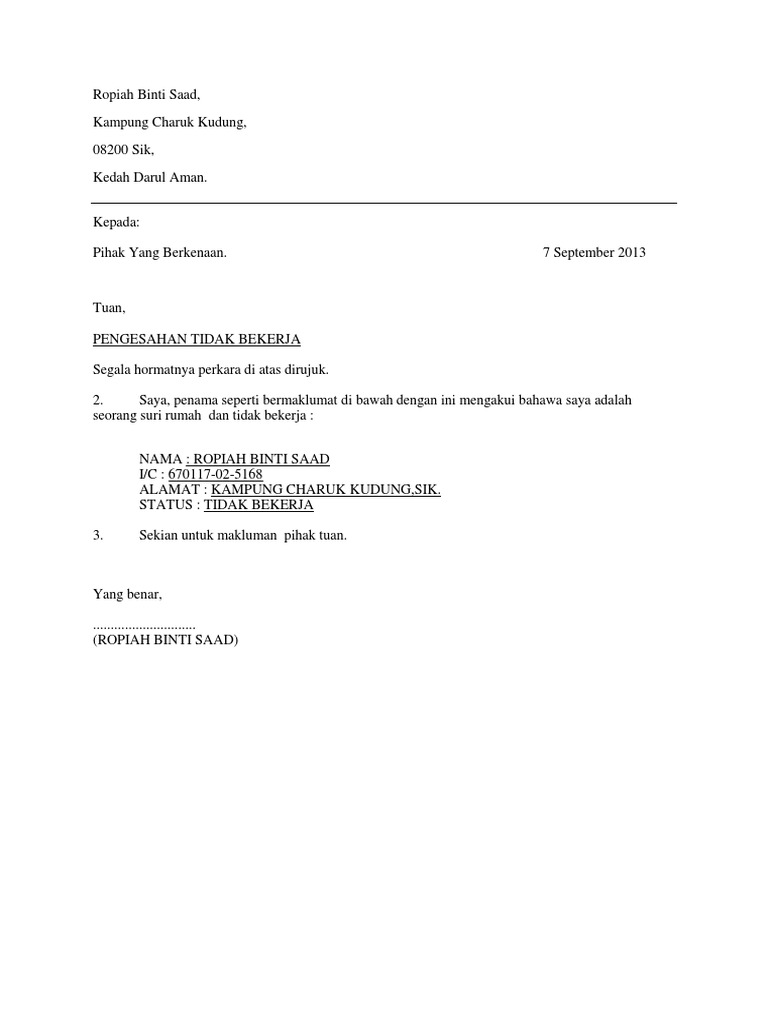 Jika anda sedang mencari informasi terkait contoh surat permohonan. Pengurus abc sdn bhd, 06000 alor setar, kedah darul aman. Saya dengan ini juga mengesahkan penama sememangnya bekerja sendiri tidak bekerja dan pendapatannya adalah seperti yang. Lembar pengesahan digunakan untuk berbagai keperluan yang beragam. Formulir contoh surat pernyataan tidak bekerja bagi wp orang pribadi. Contoh surat perjanjian jual beli rumah. Cara menulis surat ini cukup mudah, anda bisa melihat secara langsung contoh surat permohonan izin kegiatan yang baik dan benar di internet, ada dengan adanya izin surat permohonan kegiatan maka acara atau kegiatan yang berlangsung didalamnya akan berjalan lancar tanpa adanya hambatan. Surat sendiri saat ini masih banyak digunakan baik dalam urusan resmi maupun tidak resmi. Rumah selangorku pangsapuri harmoni 1 putra heights 1 cute766. Ada berbagai contoh surat undangan dengan berbagai jenis kegiatan seperti surat undangan rapat, pernikahan, reuni, dan sebagainya. Contoh surat penagihan akan kamu temukan di sini. Surat pengesahan tidak bekerjafull description. Semoga dengan perkongsian portal malaysia mengenai contoh surat pengesahan majikan dan jawatan ini dapat membantu serta menjadi panduan kepada korang yang.